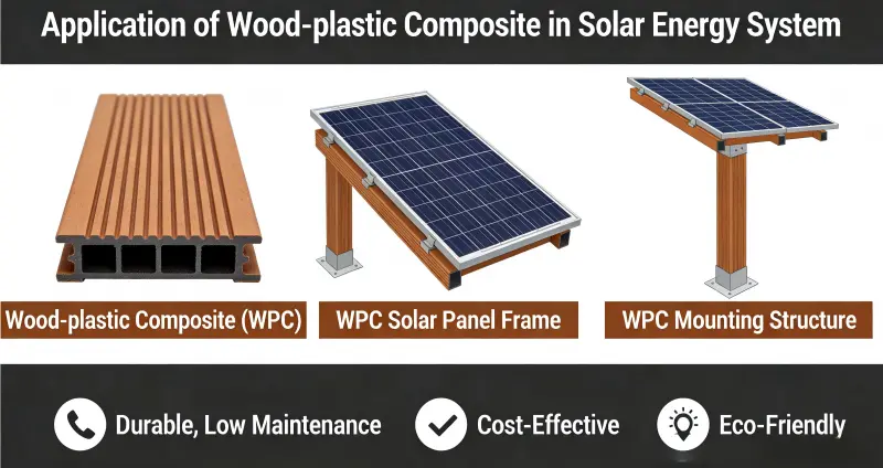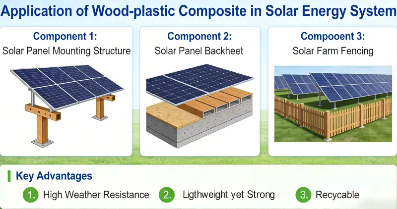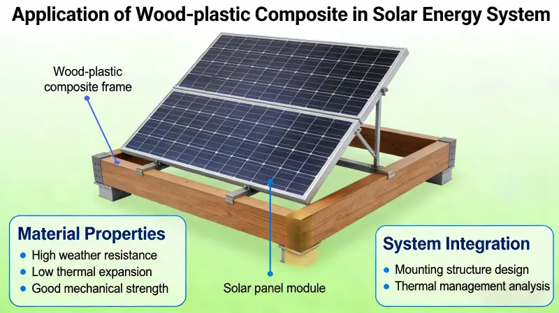 Komposit kayu-plastik (WPC) telah muncul sebagai material utama dalam sistem energi surya, termasuk dudukan fotovoltaik (PV), pembangkit listrik terapung, integrasi gedung PV, dan penyimpanan tenaga surya terkonsentrasi (CSP), karena sifatnya yang ramah lingkungan, tahan cuaca, ringan, rendah perawatan, dan mudah diproses. Ini secara bertahap menggantikan material logam dan kayu tradisional.