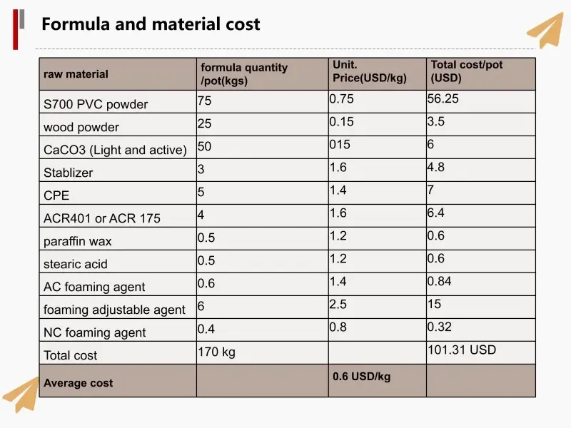 Bahan baku pembuatan panel pintu dan kusen pintu WPC antara lain: resin PVC, serbuk kayu, CaCo3 dan bahan kimia tambahan, pabrikan dapat menyesuaikan formulasinya sesuai kebutuhan produk pasar.